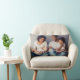 Modern and stylish custom throw pillow design features a favourite photo with a minimal white "Love" typography overlay design that includes flourish and heart details. The white coloured text can be customised.