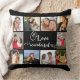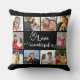 Romantic Quote and Custom Photo Pillow. The main wording is hand lettered and reads "Love is a Wonderful Thing" in playful calligraphy with love hearts. The photo template is set up for you to add your pictures, working clockwise from the top left, to form a simple grid style photo collage to frame the slogan. This design is black and silver grey and more colours choices are available in my store. Alternatively, you can click "customise further" to choose your own colours or message me for assistance.