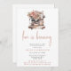 Vintage style Love is Brewing Coffee Machine Bridal Shower Invitation in brown and peach with flowers.
