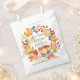 Love is brewing fall themed bridal shower thank you favour bags, watercolor fall leaves and berries wreath and pumpkin cup of tea for autumn themed tea party bridal shower favour bags