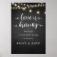 Love is Brewing, Modern Rustic, Wedding Rehearsal Dinner Welcome Poster, in rustic black chalkboard background, cottage string lights themed.