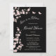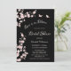 This elegant blush pink and black bridal shower invitation showcases the saying 'Love is in bloom,' adorned with beautiful blush pink cherry blossoms and two butterflies on a black background. The backside includes a QR code for the person of honour's gift registry.