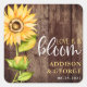 Elegant wedding favour sticker for your summer or fall wedding! Watercolor sunflowers on a barn wood background. The typography text says "Love Is In Bloom." Use this template sticker for your rustic country theme wedding. Customise this product by adding your own names and event date. Beautiful yellow floral design.