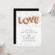Unique engagement party invitations feature "LOVE" spelled out in rose gold balloons, on a background of rose gold, gold and black confetti. Personalise with your engagement party details in modern black lettering. Invitations reverse to solid black.
