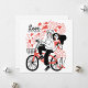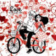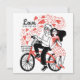A whimsical illustration of a couple on a bicycle, exuding joy and affection. The man, wearing a playful expression,