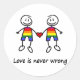 Love is never wrong t-shirts and gifts - gay pride design with two people in rainbow colours holding a red heart.