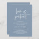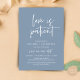 This is the Wedding party invitation Rescheduled (postponed / postponement) card (Love is patient), change the date card, in the modern minimal romantic simple clean design dusty blue theme. It is the perfect way to make the event reschedule announcement to your friends and family.