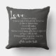 Charcoal grey throw pillow with scripture verse from Corinthians (Love is patient, love is kind....). Front of pillow has the verse scripted in white letters on grey pillow. Back of pillow is white pinstripes on grey. Nice gift of faith for the newlywed couple, or anniversary gift for the one you love!