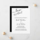 Wedding postponement announcement card with minimalist black and white colour palette. Love is Patient,, along with the names of the bride and groom, is handwritten in elegant script. The template is set up for you to customise your wedding update message to suit. The sample wording reads "due to recent events the wedding of [your names] has been postponed. We will let you know as soon as we set a new date. It was a difficult decision and we thank you for your understanding" - which you can keep or edit as you wish.
