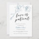 Elegant and modern wedding postponement announcement card featuring a hand drawn illustration of magnolia flowers in dusty blue colour with a script text below that says "love is patient."