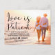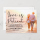 Announce your wedding date has been postponed with this custom photo love is patient change the date announcement postcard. This modern design template features your photo with text in black script that "Love is Patient" with a message and your names and town/state below. The back of the postcard has more of your wedding postponement details to personalise along with your wedding website url to keep your guests updated! Congrats on your engagement and upcoming marriage! Designed by artist ©Susan Coffey.