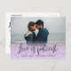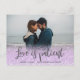 Event postponed announcement template - simple photo "Love is Patient" script postponed wedding announcement postcard. Modern unsave the date photo postcard with full horizontal photo, you can change it easily. Feature an elegant handwritten typography design with grey colour text „Love is Patient” on light purple or lavender purple glitter ombre overlay frame. #3339 If you need help or matching items, please contact me.