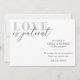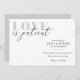 Custom-designed wedding postponement/change the date announcement card featuring "love is patient" classic modern style typography design.