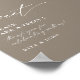 My thoughts on this product was excellent. Well printed in a gloss finishing and just the size l ordered. It arrived in good condition and am overall satisfied with the product. The printing turned out great. I was quite surprised with the finishing touch to the poster. The semi gloss was just right and a perfect size to display at the wedding.