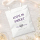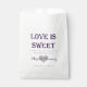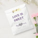 A custom favour bag reading "Love is sweet. Thank you for sharing our special day." Personalised with the bride and groom's names written over a heart, and the wedding date. Perfect for favours, candy buffets, and more!