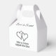 Love is sweet double heart wedding logo custom Favour Boxes. Cute two hearts one love design with names of bride and groom plus date of marriage. Romantic interlocking love icons with fun tagline. Great for desserts, treats, cake, sweets, cookies, cupcakes, doughnuts etc. Add your own quote or slogan optionally.