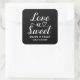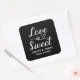 Stylish wedding favour stickers featuring the "Love is Sweet Enjoy a Treat" featured text in modern heart script calligraphy with the couple's names on a bold black background. The chic square format is perfect for candy favour boxes, dessert bar packaging, or gift bags at your wedding celebration. All text is fully customisable.