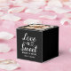 Elegant custom wedding photo favour box features a modern heart calligraphy script "Love is Sweet" design, along with a stylish minimal monogram of the bride and groom first names and "enjoy a treat" message that can be personalised. The top of the box includes a favourite photo of the couple. Black and white colours can be modified to coordinate with your wedding colour scheme.