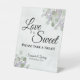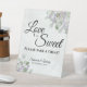 This tabletop sign is perfect for a treat table at your wedding reception. It features a rustic hand painted watercolor design with script lettering and sprigs of eucalyptus leaves and lavender flowers in shades of sage green and purple. The sign reads: Love is Sweet, please take a treat! There is room for your names and the wedding date below.