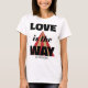 LOVE is the WAY, what a beautiful statement of love for your white women's t-shirt. "LOVE" and "WAY" are printed in a modern massive black font, while "is the" is written smaller in italic. Under the text, the way is suggested by a road in perspective with black and gold stripes. At the bottom, you will find a customisable name written in a modern black dotted typeface. Please, replace the default name with the one of your choice.