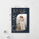 Elegant Hanukkah photo card featuring an elegant typography design "Love Joy Light" in faux gold wrapped around an arch photo frame. Sparkling gold stars create the star of David. The reverse side features an elegant starry twinkling star of David pattern. Artwork by Moodthology Papery.