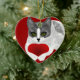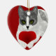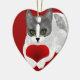 A digital illustration of a serious white and grey kitty, protective of a little red heart.