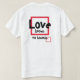Black and red "Love knows no bounds" T-shirt boldly features the word Love in bold black text that extends outside the box of red. On the back, "Love Knows No Bounds" escapes the confines of the red edges of a box along with a red heart. In any available style for men, women, children, babies or infants, this is a bold declaration of unconditional love.