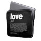 The sleeve is made of nice feeling material and seems very durable. I'm not sure how easy it'll be to clean, but the construction seems sound and the fabric is quick thick. I also like the double zipper. The printing is lovely and appears durable. The white on black contrast is nice, and the design very elegant.