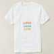 The t-shirt design features the words "Love, Laugh, Live" in a bold, modern font. Each word is a different bright colour, creating a vibrant and eye-catching design. The words are arranged in a fun and playful way, suggesting a positive and optimistic message.