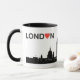 We love London, and to show it, we enjoy our coffee from this stylish designer coffee mug resplendent with silhoetted buildings from the London skyline and the name London with a heart replacing the second 'O'.