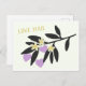 Valentine's day greeting postcard with cute flat illustration and text "Love Mail". Black branch, vanilla flowers and violet hearts.