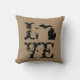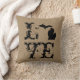 Sweet "love" vintage style black font typography text with the state of Michigan silhouette on a faux linen jute burlap rustic chic shabby country chic I love Michigan cotton throw pillow.