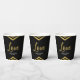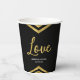 These modern paper cups feature an elegant geometric chevron design and the word "Love" in faux gold foil against a black background; perfect for an Engagement Party or Anniversary Party.