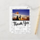 A classy postcard with Thank You written in a script font and accented by the couple's name in a modern font. There's space for your favourite wedding photo. Love is a cute word art pattern in light grey. The back has room for a handwritten note.