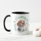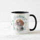 "LOVE MY BEAGLE" declares this mug for the Beagle Dog owner. Each side of the mug has a beautiful watercolor portrait of a Beagle in a blue green leaf wreath. Between the two images is the text, which may be easily customised, or even removed, by you.