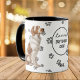 This mug for the Brittany Dog owner features a beautiful portrait of a sitting Brittany. The image is printed twice, and between them is an oval with the black text that says "Love my Brittany Dog". The oval and dog images are placed on a white background sprinkled with paw prints. Your monogram or name can be placed in a text field at the bottom.