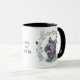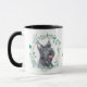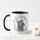 Each side of this mug has a beautiful watercolor portrait of an adorable black Scottish Terrier Dog in a blue green leaf wreath. Between the two images is text which says "LOVE my SCOTTIE" in black. The text may be easily changed, or even removed, if you prefer.