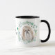 "LOVE my SHIH-TZU" declares this mug for the owner of a Shih-Tzu Dog. Each side of the mug has a beautiful watercolor portrait of a Shih-Tzu framed within a blue green leaf wreath. Between the two images is the text, which may be easily customised, or even removed, by you.