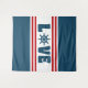 Love nautical design with sailing wheel decoration on blue, red and white striped background
