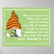 Sweet poster features Irish girl gnome with shamrocks and gold /green textured background :