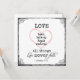 Love never fails bible verse wedding invitations with silver background, light pink heart accent, black typography. Square invitations include antique floral edges. Love bears, believes, hopes, endures all things; Love never fails scripture from I Corinthians 13; 7, 8. See more at Christian Quotes; Link below: