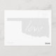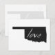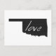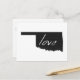 Oklahoma love is easy to spread everywhere through the mail with this post card. With the shape of the Sooner state of Oklahoma filled in black and the word love written inside with white hand written lettering the message is clear that you love the State of Oklahoma.