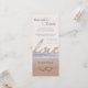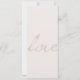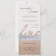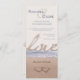 This thin wedding invitation features a photo of two hearts below an ocean wave on the sand. The word "love" in a script font separates the photo from the rest of the simple cream-coloured invitation, where dark ocean blue words in a classic engraving-style font invite guests to your wedding. All text except "love" is customisable on the invitation.