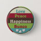 Stylish and modern Bunco button featuring the words:Love,Peace,Happiness and Bunco. Also featured are three white Bunco dice. Keep on rolling!