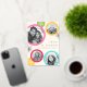 Christmas holiday card with your custom photos on colourful circles. Customisable text "Love and peace", and your family name. Accents in real foil
