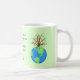 Enjoy drinking your coffee or favourite beverage in this mug personalised with your name at the bottom of the mug! This mug is a great way to show your love of the beautiful earth and to promote Earth Day with colourful art and a poem of words about loving, saving and protecting planet earth. The art is original art and words by Phyllis Dobbs and has a blue and green earth globe. A growing tree with green leaves is behind the earth. The words say "Love the seas, the sky and the earth's ground to keep it beautiful and forever around". The earth art images are on both sides of the mug with the words centred between them. The art and words pop on a lime green background. These words and art show the beauty of earth, to love and save, and is available on other products in this store and other background colours. (The word saying is copyrighted and cannot be used on other products than the products in this store without permission).