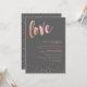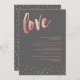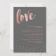 Wedding invitation in an elegant combination of rose gold and dark grey, with love written in a pretty brush script, and discreet confetti.