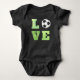 Cute baby bodysuit with a grass green word "LOVE" and a soccer ball instead of "O". Black background.