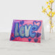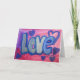 Painting of the word "Love" in cotton candy blue against a pink and purple bubble gum coloured background. Purple and blue hearts dance around the letters. There is a light layer of blue and silver glitter over the top. Personalise this love word art greeting card with your own text and images using the "Customise It" button.