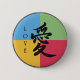 A round pop art background of blue, green, gold, and red serves as the backdrop to a Kanji Calligraphy symbol of LOVE, in black silhouette form. Spread the message of love in hip fashion! Great gift idea!